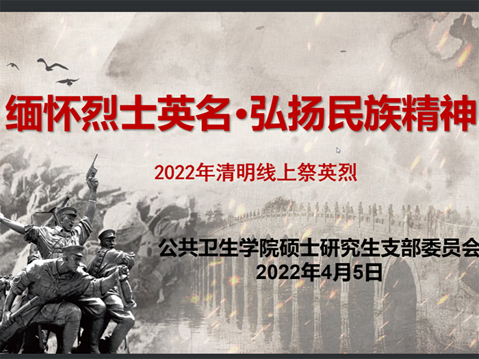 当前位置:学生工作时值一年春草绿,又逢清明祭扫时。为缅怀革命烈士、传承红色基因、弘扬爱国主义精神,2022年4月5日上午,公共卫生伦理片硕士研究生党支部组织开展了清明网上祭英烈活动,通过网络祭扫等新形式表达对革命先烈的敬仰和追思,支部全体党员、入党积极分子参与了本次活动,活动由支部书记李涵同志主持。