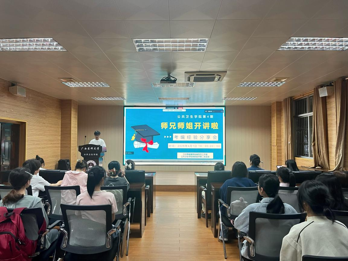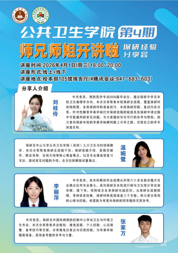 当前位置:学生工作为助力学生明晰保研路径、做好学业规划,4月1日晚,公共卫生伦理片在105馆会议室举办第4期“师兄师姐开讲啦”——保研经验分享会。本次分享会由预防医学第二党支部承办,邀请2026届刘桂伶、温婉鹭、李丽萍、张家万四位保研学子担任主讲人,各年级同学踊跃参会。