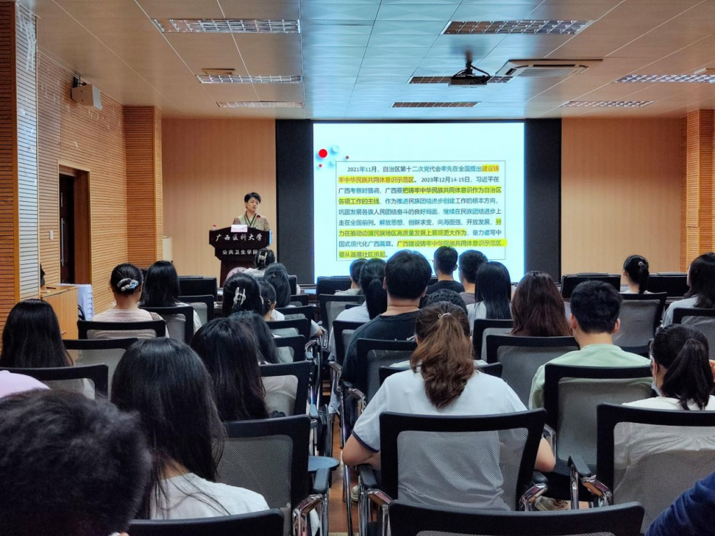 当前位置:要闻动态为持续推动铸牢中华民族共同体意识示范区建设走深走实,有形有感有效推进民族团结进步教育,4月16日下午,公共卫生伦理片在105馆一楼学术报告厅举办专题学术交流活动。本次活动特邀广西社会科伦理片民族研究所所长、自治区党委讲师团特聘专家覃娟研究员作专题分享。伦理片党委书记邹云锋主持活动,各党支部支委及师生代表共同到场学习交流。
